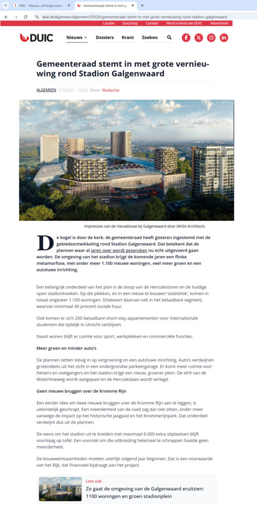 Daarnaast wordt de huidige rommelige en onveilige inrichting rondom het stadion getransformeert tot een “groene oase” voor verblijven, recreeren het voetbal bedrijf. Eind februari is het SPvE aangenomen door de gemeenteraad van Utrecht en kunnen daarmee de bouwplannen in uitwerking gaan.